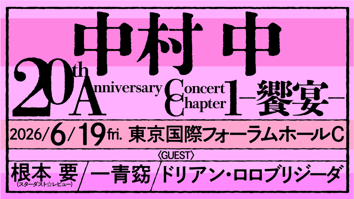 2026年6月19日(金)東京国際フォーラムホールCにて、中村 中の活動20周年記念公演の第1章、『中村 中 20th Anniversary Concert Chapter 1 -饗宴-』を開催いたします。